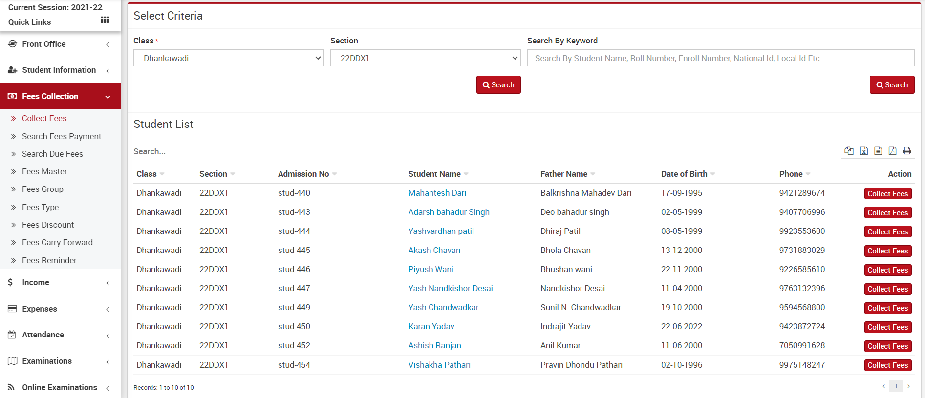 This section allows you to add and view Fees Group,Fees Discount, Collect Fees. Add Search due fees,Carry forward fees.