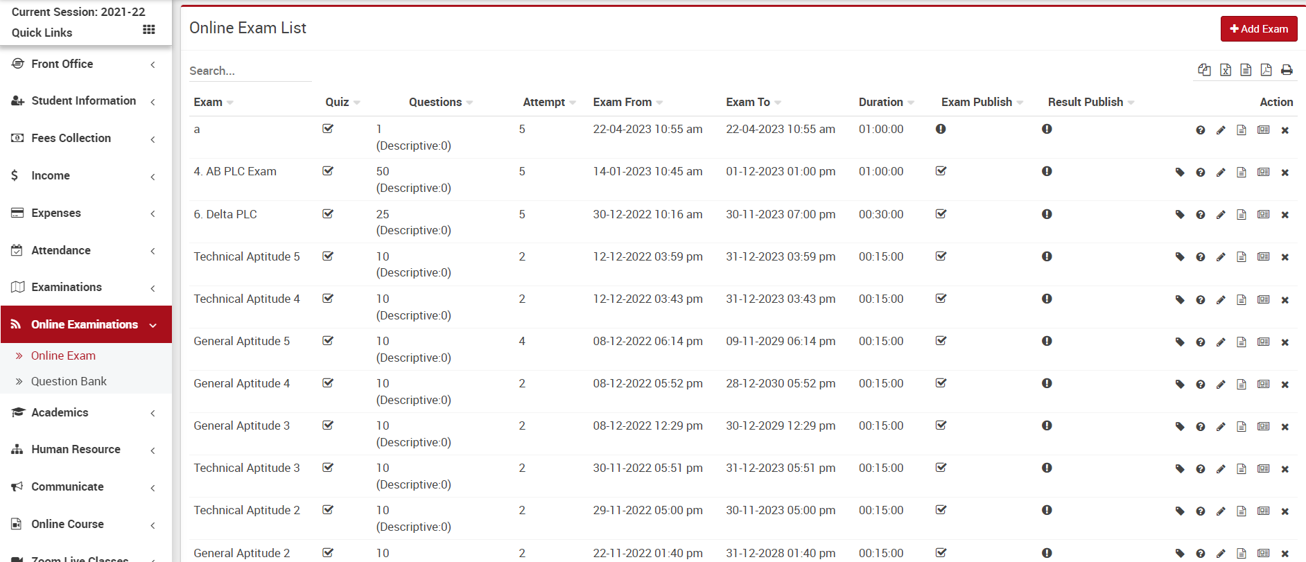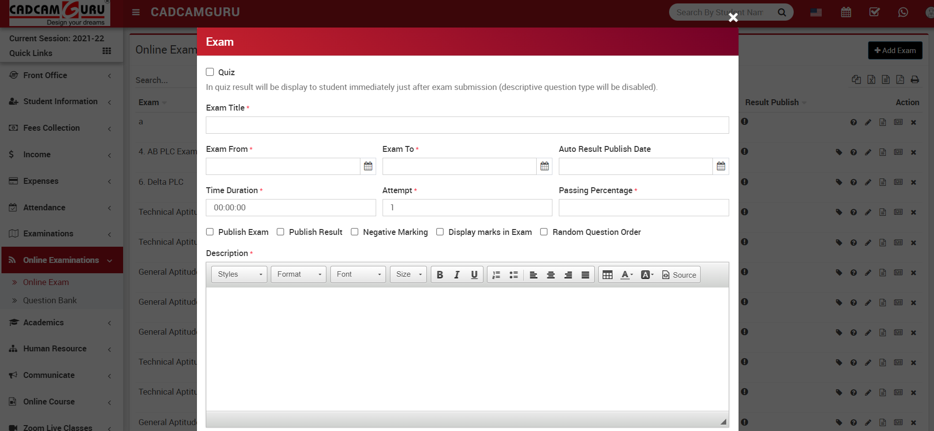 This section allows you to add and view Marks Grade, Exam Group, Subject in Exam, Marks in Exam. It also links two exams and also assign & view Exam.
