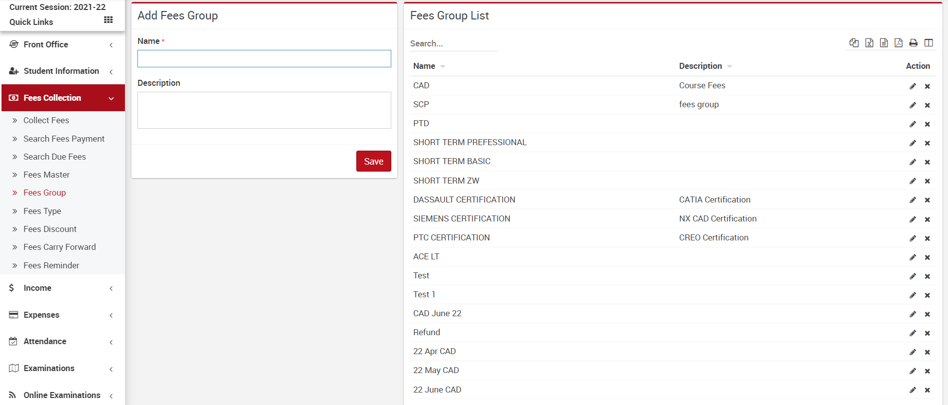 This section allows you to add and view Fees Group,Fees Discount, Collect Fees. Add Search due fees,Carry forward fees.